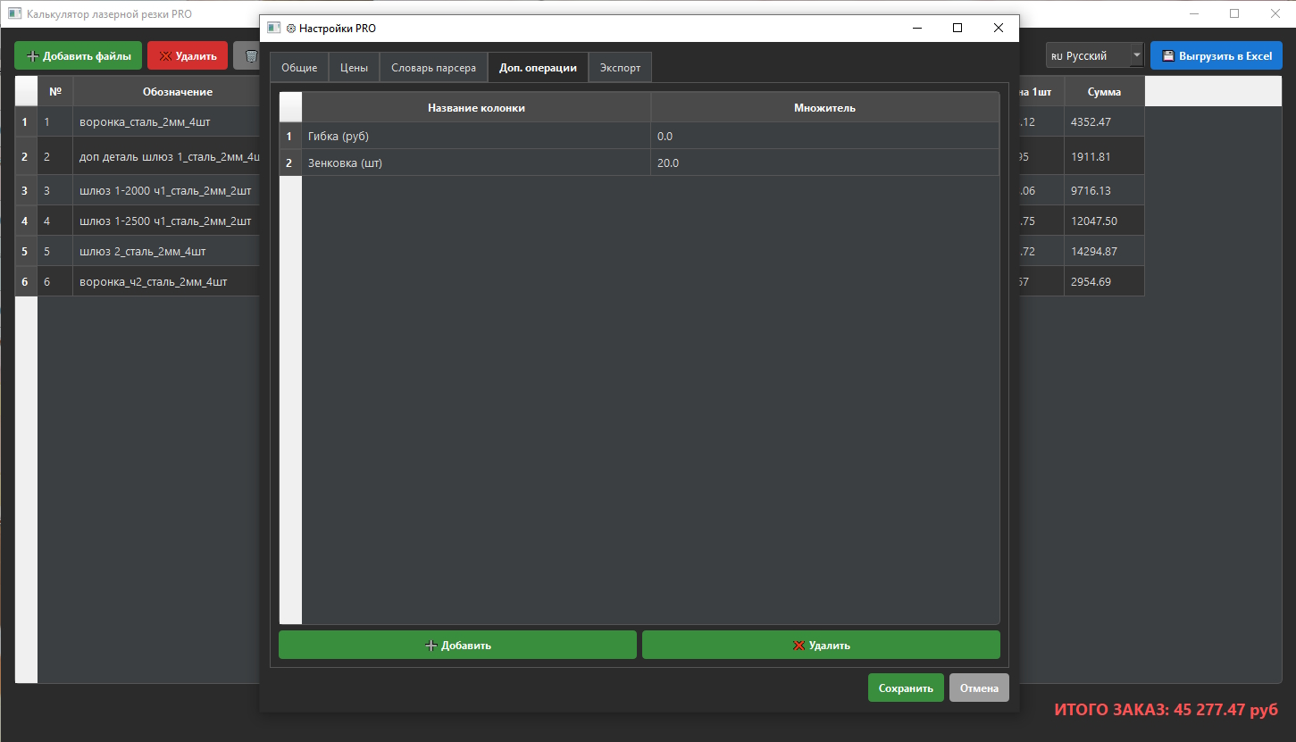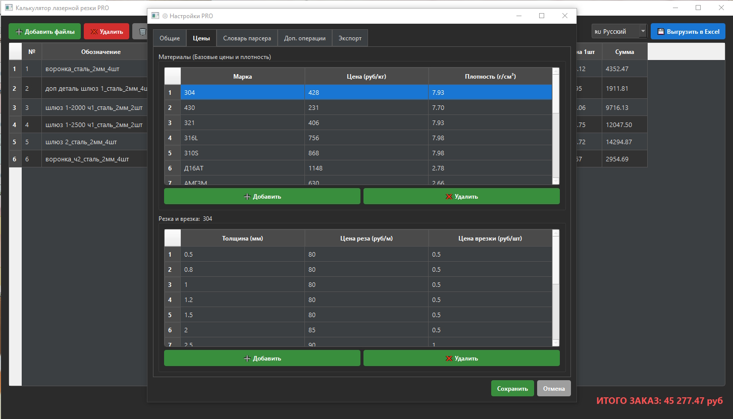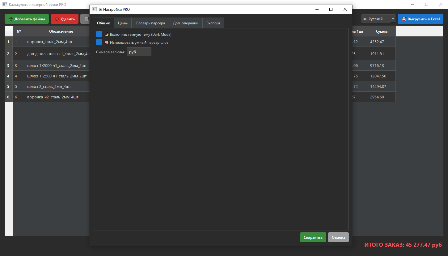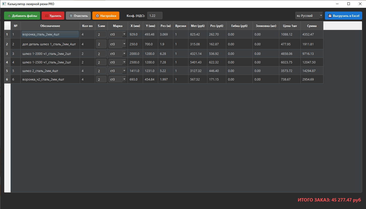 Вся смета как на ладони: габариты по X и Y, длина реза в метрах, количество врезок, цена за металл, цена за работу и итоговая стоимость за деталь/партию. Нужно посчитать с НДС? Просто впишите коэффициент (например, 1.22), и сумма обновится моментально.